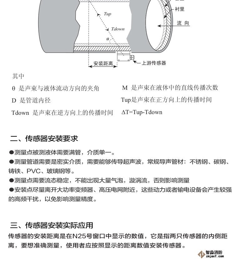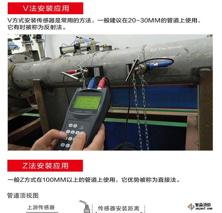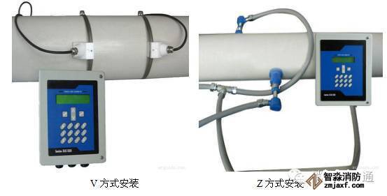 超声波流量计的传感器一般采用V方式和Z方式安装,通常情况下,管径小于300mm时,采用V方式安装,管径大于200mm时,采用Z方式安装。对于即可以用V方式安装又可以Z方式安装的传感器,尽量选用Z方式。实践表明,Z方式安装的传感器超声波信号强度高,测量的稳定性也好,图2。