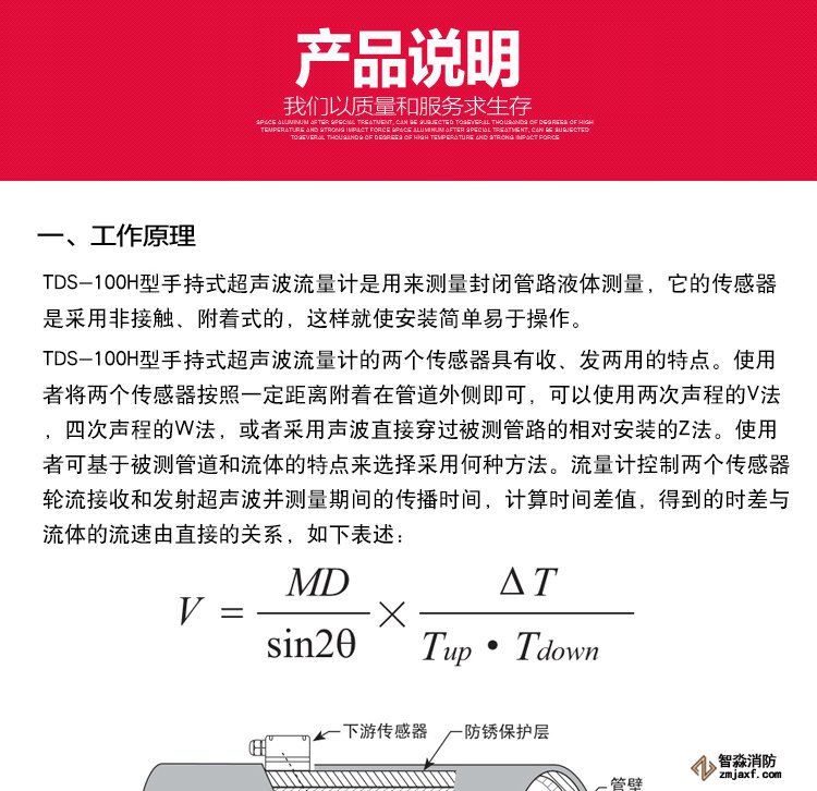 超声波在流动的流体中传播时就载上流体流速的信息。因此通过接收到的超声波就可以检测出流体的流速,从而换算成流量,图1。